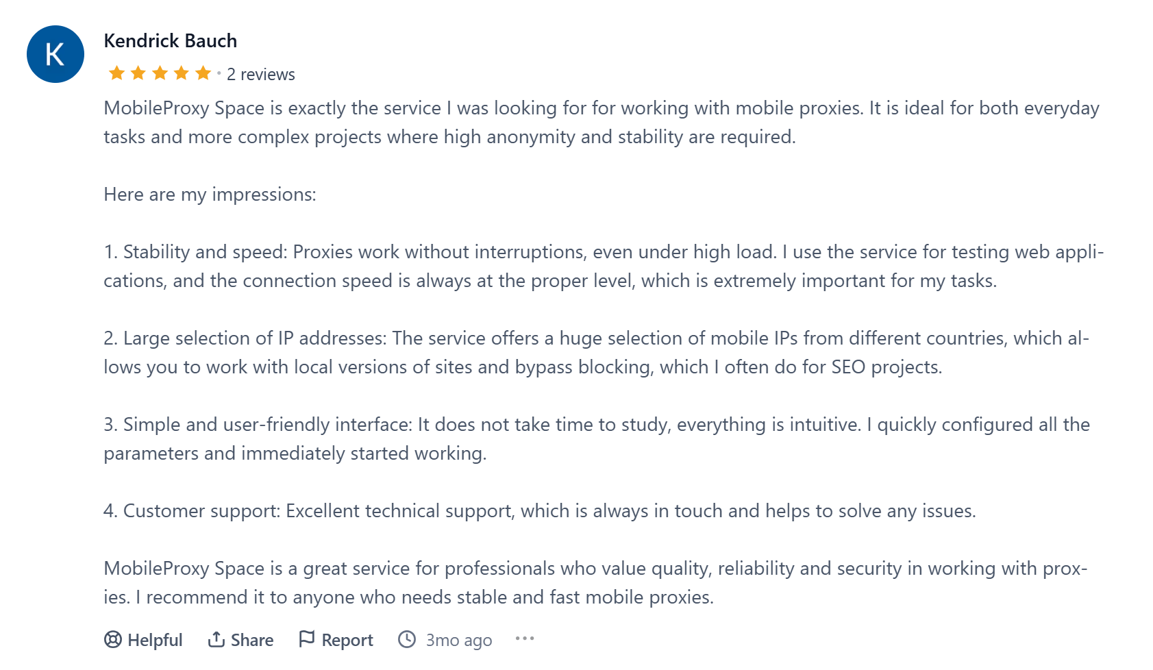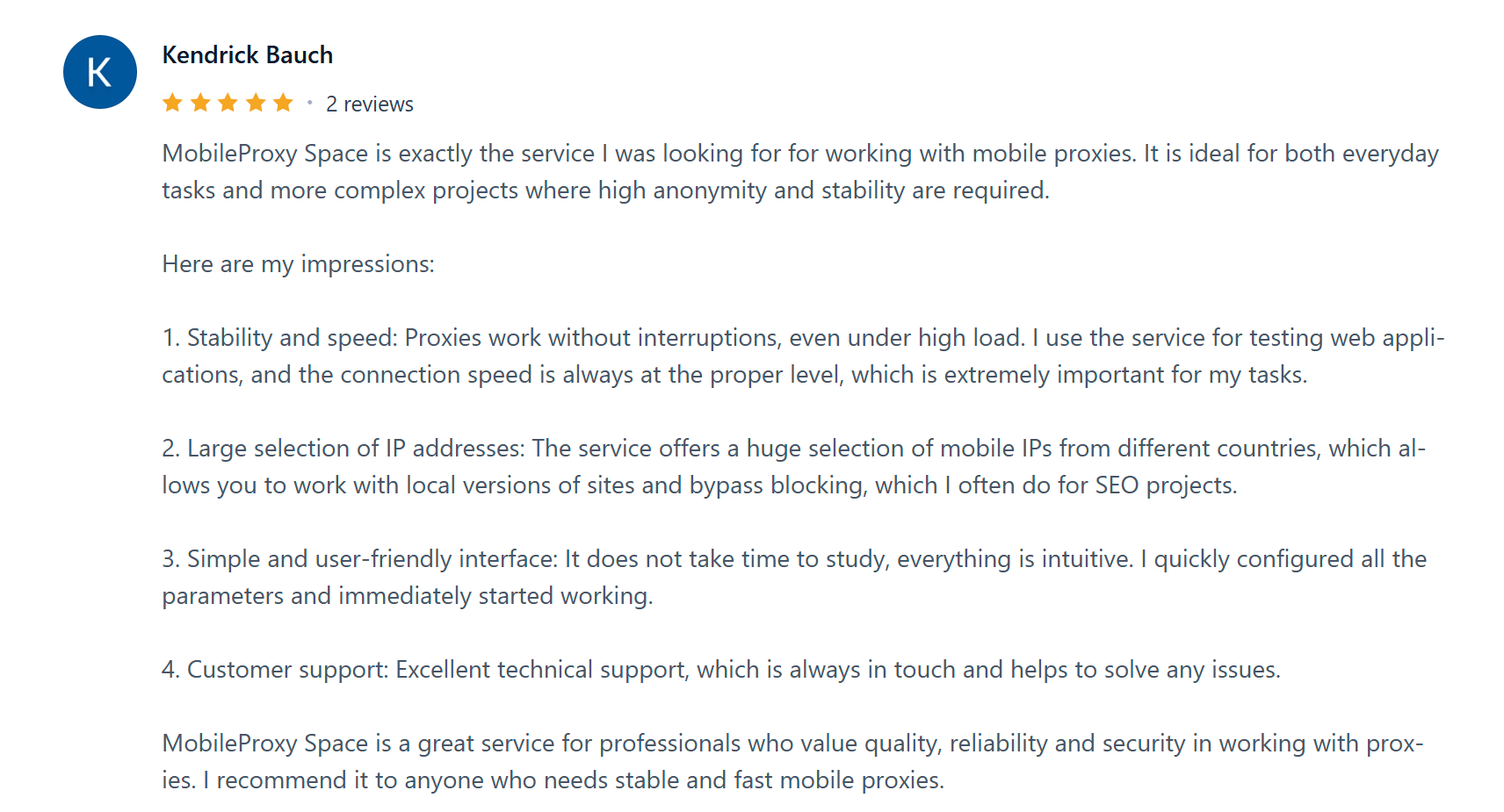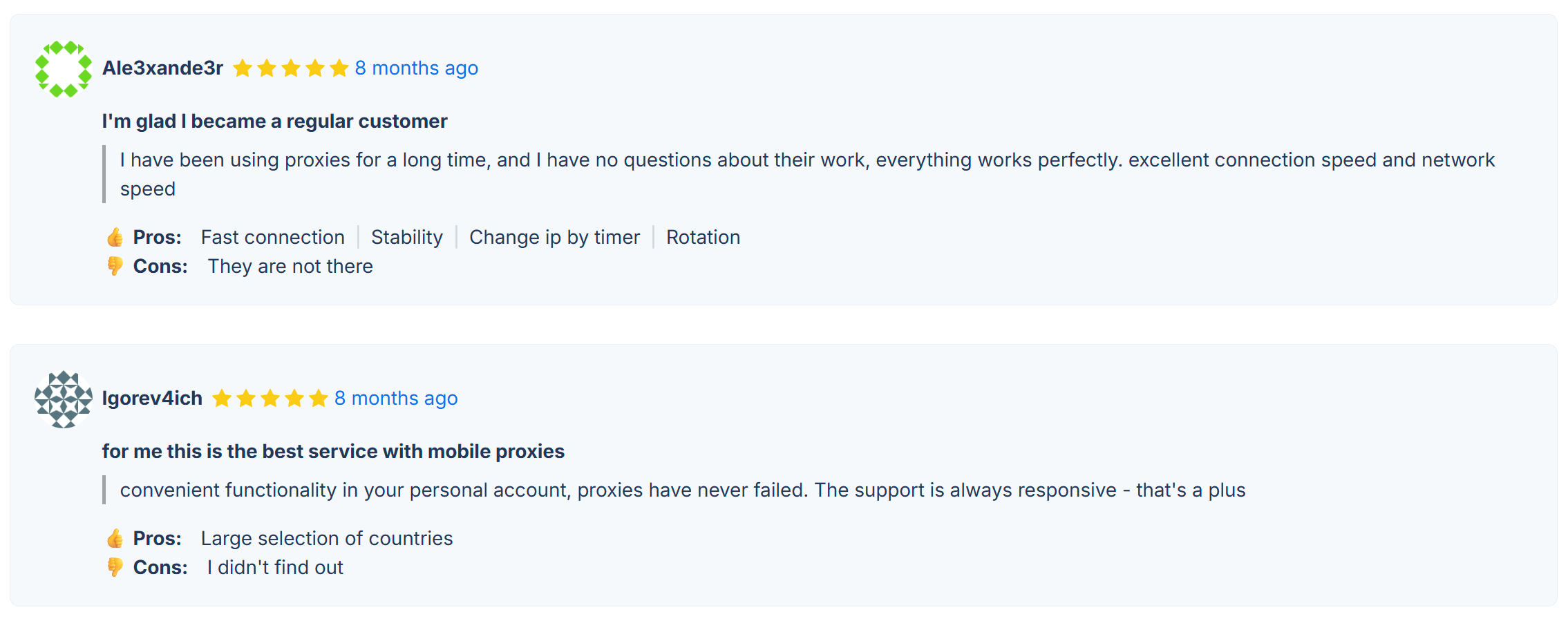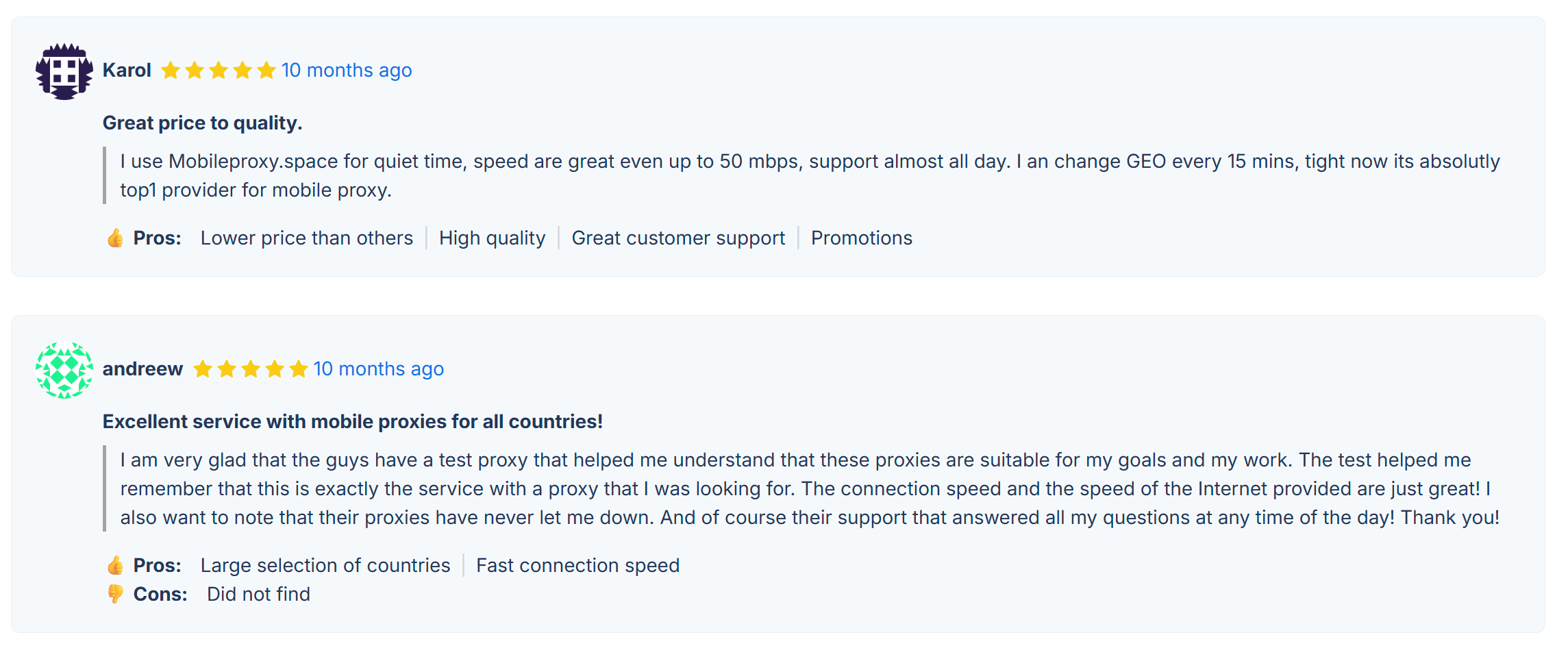 We have a large mobile proxy database that is instantly updated and available only to our clients. All provided proxies are reliable, meaning they are not detected as proxies, while the IP address belongs to the user. When you purchase our mobile proxies, you can be sure that all our proxies are exclusive and have no limitations! We have no emulation or virtualization of mobile proxies. You can be confident that you are working with real mobile proxies from GSM operators!
